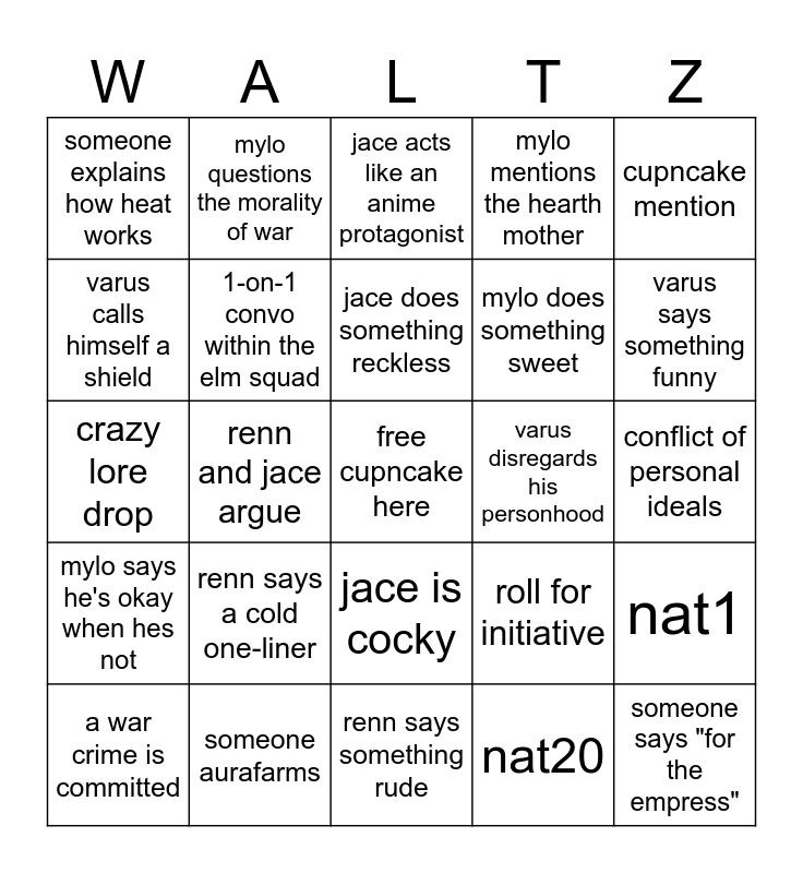 This bingo card has a free space and 24 words: renn says a cold one-liner, someone aurafarms, jace does something reckless, a war crime is committed, cupncake mention, someone explains how heat works, varus calls himself a shield, mylo questions the morality of war, varus disregards his personhood, jace is cocky, mylo does something sweet, crazy lore drop, roll for initiative, nat1, 1-on-1 convo within the elm squad, nat20, conflict of personal ideals, jace acts like an anime protagonist, varus says something funny, renn and jace argue, someone says "for the empress", mylo says he's okay when hes not, mylo mentions the hearth mother and renn says something rude.
