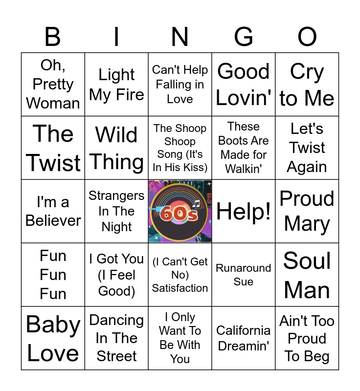 This bingo card has a free space and 43 words: Ain't No Mountain High Enough, Ain't Too Proud To Beg, All I Have to Do Is Dream, Baby Love, Be My Baby, California Dreamin', Can't Help Falling in Love, Can't Take My Eyes off You, Cry to Me, Dancing In The Street, Good Lovin', Help!, (I Can't Get No) Satisfaction, I Got You (I Feel Good), I Heard It Through The Grapevine, I Only Want To Be With You, I Want You Back, I'm a Believer, In the Midnight Hour, Let's Twist Again, Light My Fire, Louie Louie, My Girl, Oh, Pretty Woman, One Fine Day, Proud Mary, Respect, Ring of Fire, Runaround Sue, Fun Fun Fun, Son of a Preacher Man, Soul Man, Stop! In The Name Of Love, Strangers In The Night, Suspicious Minds, Sweet Caroline, The Letter, The Shoop Shoop Song (It's In His Kiss), The Twist, These Boots Are Made for Walkin', Walk Like a Man, Wild Thing and You Can't Hurry Love.