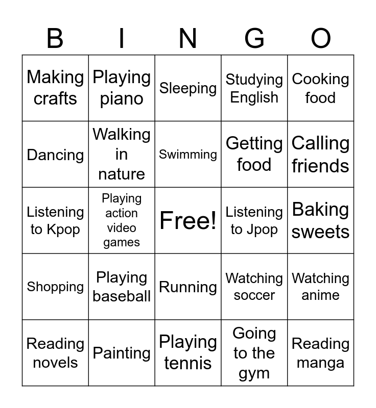 This bingo card has a free space and 24 words: Playing baseball, Painting, Swimming, Reading novels, Cooking food, Making crafts, Dancing, Playing piano, Listening to Jpop, Running, Getting food, Listening to Kpop, Watching soccer, Watching anime, Walking in nature, Going to the gym, Baking sweets, Sleeping, Calling friends, Playing action video games, Reading manga, Shopping, Studying English and Playing tennis.