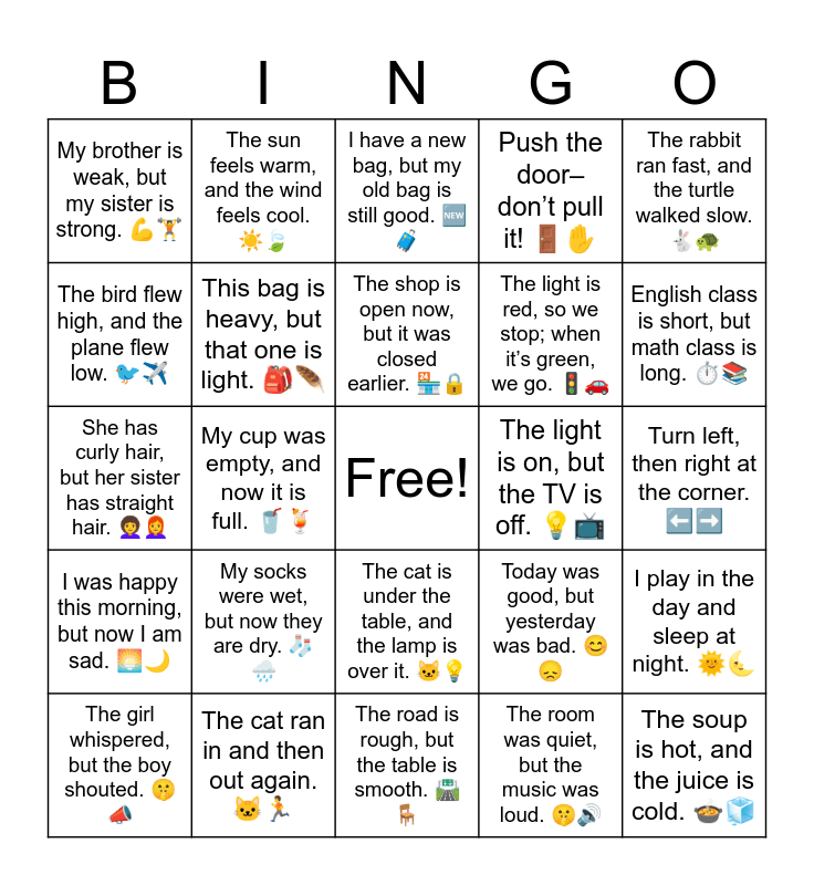 This bingo card has a free space and 36 words: The big dog barked at the small cat. πΆπ±, The short boy stood next to a tall girl. π¦π§, This street is narrow, but that road is wide. πΆββοΈπ£οΈ, This bag is heavy, but that one is light. ππͺΆ, Today was good, but yesterday was bad. ππ, I was happy this morning, but now I am sad. π π, The shop is open now, but it was closed earlier. πͺπ, Dad said yes, but Mom said no. π¨π©, The rabbit ran fast, and the turtle walked slow. ππ’, The young child helped the old man. πΆπ΄, My cup was empty, and now it is full. π₯€πΉ, Push the doorβ donβt pull it! πͺβ, The bed is hard, but the pillow is soft. ποΈπ, The light is on, but the TV is off. π‘πΊ, English class is short, but math class is long. β±οΈπ, My brother is weak, but my sister is strong. πͺποΈ, The baby can laugh and cry. πΆπ, My socks were wet, but now they are dry. π§¦π§οΈ, The soup is hot, and the juice is cold. π²π§, I have a new bag, but my old bag is still good. ππ§³, Turn left, then right at the corner. β¬ οΈβ‘οΈ, I play in the day and sleep at night. ππ, The cat ran in and then out again. π±π, The girl whispered, but the boy shouted. π€«π£, The road is rough, but the table is smooth. π£οΈπͺ, The sun feels warm, and the wind feels cool. βοΈπ, She has curly hair, but her sister has straight hair. π©βπ¦±π©βπ¦°, The baby is asleep, but Dad is awake. π΄π, The light is red, so we stop; when itβs green, we go. π¦π, The bird flew high, and the plane flew low. π¦βοΈ, The ant jumped up and then fell down. πβ¬οΈ, The table is square, but the clock is round. β¬π°οΈ, The room was quiet, but the music was loud. π€«π, The cat is under the table, and the lamp is over it. π±π‘, The book is on the top shelf, not the bottom one. πβ¬οΈ and Your answer is right, but mine is wrong. βοΈβ.