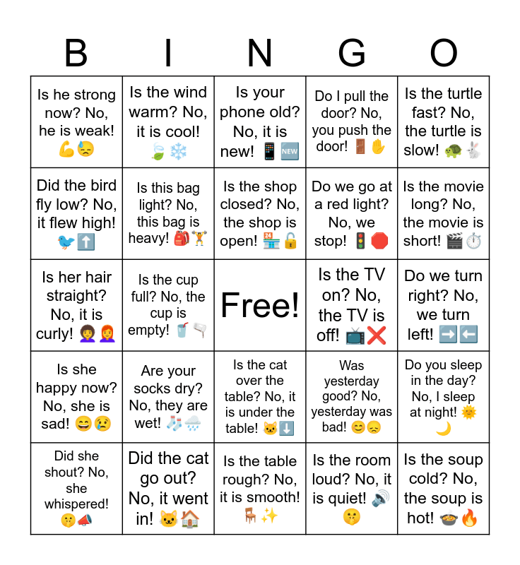 This bingo card has a free space and 36 words: Is the dog big? No, the dog is small! πΆπ±, Is the boy tall? No, the boy is short! π¦π, Is the street wide? No, the street is narrow! πΆββοΈπ£οΈ, Is this bag light? No, this bag is heavy! πποΈ, Was yesterday good? No, yesterday was bad! ππ, Is she happy now? No, she is sad! ππ’, Is the shop closed? No, the shop is open! πͺπ, Did Dad say no? No, Dad said yes! π¨π, Is the turtle fast? No, the turtle is slow! π’π, Is the man young? No, the man is old! π΄πΆ, Is the cup full? No, the cup is empty! π₯€π«, Do I pull the door? No, you push the door! πͺβ, Is the pillow hard? No, the pillow is soft! ποΈπ, Is the TV on? No, the TV is off! πΊβ, Is the movie long? No, the movie is short! π¬β±οΈ, Is he strong now? No, he is weak! πͺπ, Is the baby crying? No, the baby is laughing! πΆπ, Are your socks dry? No, they are wet! π§¦π§οΈ, Is the soup cold? No, the soup is hot! π²π₯, Is your phone old? No, it is new! π±π, Do we turn right? No, we turn left! β‘οΈβ¬ οΈ, Do you sleep in the day? No, I sleep at night! ππ, Did the cat go out? No, it went in! π±π , Did she shout? No, she whispered! π€«π£, Is the table rough? No, it is smooth! πͺβ¨, Is the wind warm? No, it is cool! πβοΈ, Is her hair straight? No, it is curly! π©βπ¦±π©βπ¦°, Is the baby awake? No, the baby is asleep! πΆπ΄, Do we go at a red light? No, we stop! π¦π, Did the bird fly low? No, it flew high! π¦β¬οΈ, Did the ant fall down? No, it jumped up! πβ¬οΈ, Is the clock square? No, it is round! π°οΈβ, Is the room loud? No, it is quiet! ππ€«, Is the cat over the table? No, it is under the table! π±β¬οΈ, Is the book on the bottom shelf? No, it is on the top shelf! πβ¬οΈ and Is your answer wrong? No, it is right! βοΈβ.