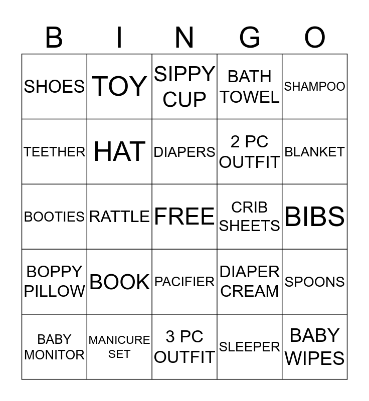 This bingo card has a free space and 24 words: BOOK, MANICURE SET, DIAPERS, BABY MONITOR, SHAMPOO, SHOES, TEETHER, TOY, CRIB SHEETS, PACIFIER, 2 PC OUTFIT, BOOTIES, DIAPER CREAM, SPOONS, HAT, SLEEPER, BIBS, SIPPY CUP, BLANKET, RATTLE, BABY WIPES, BOPPY PILLOW, BATH TOWEL and 3 PC OUTFIT.