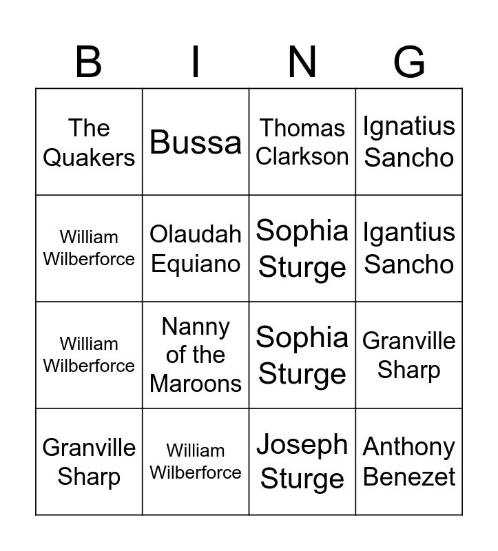 ⚠ This card has duplicate items: Ignatius Sancho (2), Nanny of the Maroons (2), Joseph Sturge (2), Anthony Benezet (2), Granville Sharp (3), Olaudah Equiano (2), Bussa (2), The Quakers (2), William Wilberforce (3), Igantius Sancho (2), Nanny of the Maroons (2)