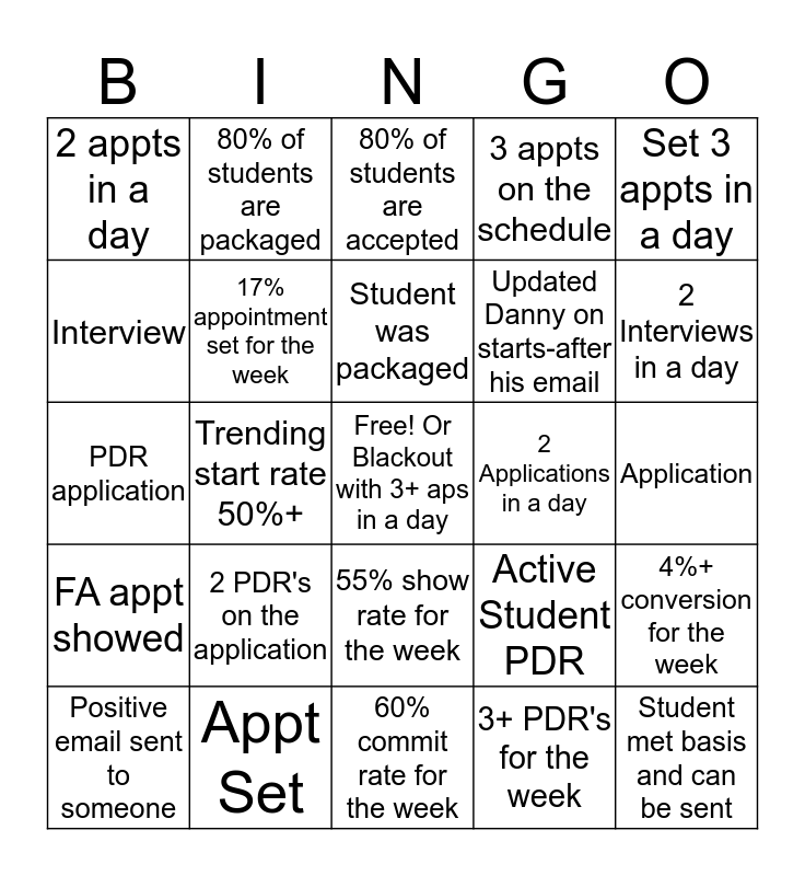 This bingo card has a free space and 24 words: 2 PDR's on the application, Appt Set, Student was packaged, Positive email sent to someone, Set 3 appts in a day, 2 appts in a day, Interview, 80% of students are packaged, 2 Applications in a day, 55% show rate for the week, Updated Danny on starts-after his email, PDR application, Active Student PDR, 4%+ conversion for the week, 17% appointment set for the week, 3+ PDR's for the week, Application, 80% of students are accepted, 2 Interviews in a day, Trending start rate 50%+, Student met basis and can be sent, FA appt showed, 3 appts on the schedule and 60% commit rate for the week.