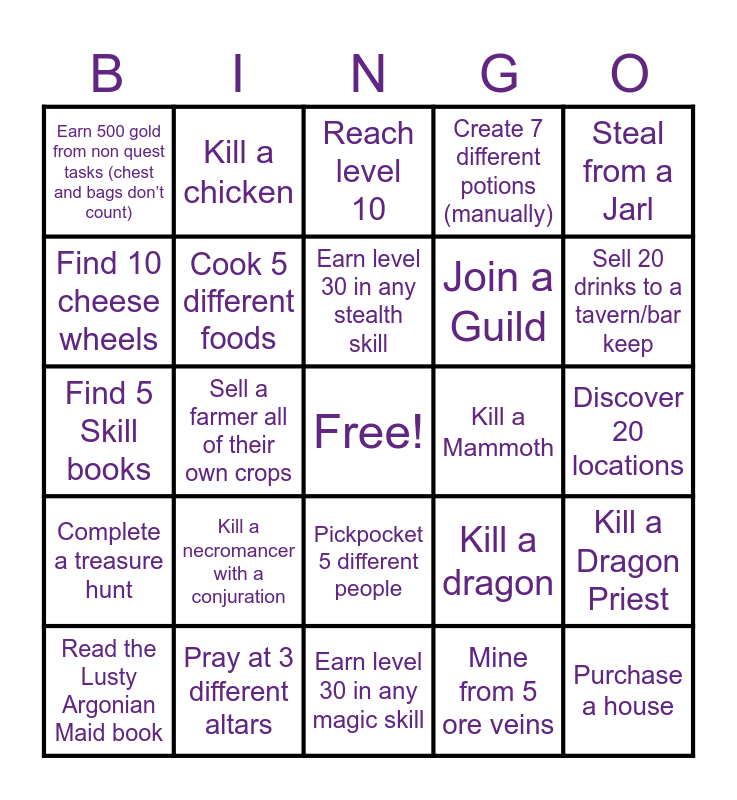 This bingo card has a free space and 50 words: Complete 3 side quests, Purchase a house, Gain a Follower, Earn level 30 in any magic skill, Kill a necromancer with a conjuration, Find 6 Ritual Stones, Kill a chicken, Go to Jail, Find 10 cheese wheels, Acquire 25 tankards, Cook 5 different foods, Create 7 different potions (manually), Kill a Dragon Priest, Kill a dragon, Learn 3 Shouts, Earn level 30 in any warrior skill, Earn level 30 in any stealth skill, Kill a Mammoth, Die to a Giant, Steal from a Jarl, Sell a farmer all of their own crops, Mine from 5 ore veins, Earn 500 gold from non quest tasks (chest and bags don’t count), Join a Guild, Travel to 5 cities, Acquire 10 gems, Sell 20 drinks to a tavern/bar keep, Sleep at 3 different inns, Reach level 10, Pickpocket 5 different people, Buy a horse, Obtain a Daedric Artifact, Pick a Master lock, Become a Vampire or Werewolf, Pray at 3 different altars, Visit 5 Cities, Eat 2 different hearts, Obtain 5 Stones of Barenziah, Win a fist fight, Discover 20 locations, Fully unlock a shout, Kill 10 rabbits, Kill 5 Deer/Elk, Learn 15 Spells, Read the Lusty Argonian Maid book, Find 5 Skill books, Kill a troll, Free a prisoner, Complete a treasure hunt and Give money to 3 beggars.