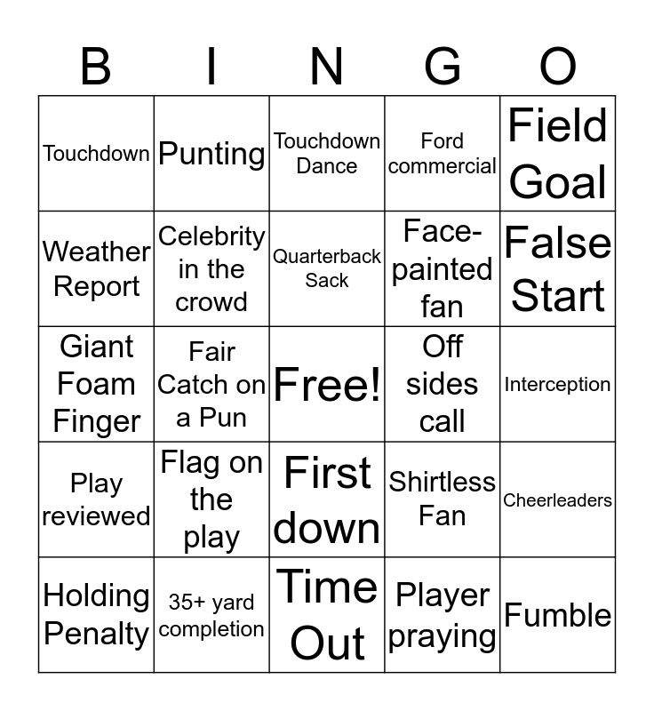 This bingo card has a free space and 25 words: Flag on the play, Time Out, Quarterback Sack, Holding Penalty, Field Goal, Touchdown, Weather Report, Punting, Off sides call, First down, Face-painted fan, Giant Foam Finger, Shirtless Fan, Cheerleaders, Celebrity in the crowd, Beer commercial, Interception, Touchdown Dance, False Start, Fair Catch on a Pun, Fumble, 35+ yard completion, Play reviewed, Ford commercial and Player praying.