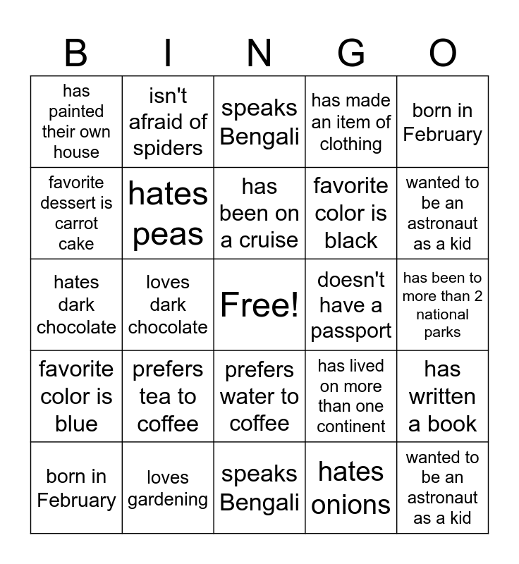 This bingo card has a free space and 50 words: likes pineapple on pizza, wanted to be an astronaut as a kid, has read A light in the Attic, speaks Bengali, prefers tea to coffee, knows how to knit, isn't afraid of spiders, loves Orlando, FL, favorite dessert is carrot cake, loves woodworking, hates peas, has made an item of clothing, has written a book, has lived on more than one continent, has been to more than 2 national parks, likes spicy food, has been on a cruise, doesn't have a passport, wanted to be a nurse as a kid, born in February, loves dark chocolate, hates onions, has painted their own house, favorite color is black, favorite food is pasta, likes pineapple on pizza, wanted to be an astronaut as a kid, has read A light in the Attic, speaks Bengali, prefers water to coffee, is vegetarian, is afraid of spiders, loves the color yellow, favorite dessert is carrot cake, loves gardening, hates sweets, has made a toy, has written a book, has visited more than one continent, has been to more than 2 national parks, likes spicy food, has been on a cruise, has been to more than 3 countries, wanted to be a nurse as a kid, born in February, hates dark chocolate, love asparagus, has painted their own house, favorite color is blue and favorite food is pasta.