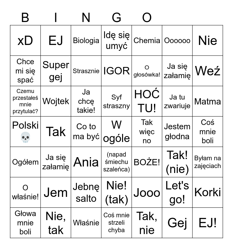 This bingo card has a free space and 48 words: Ogółem, Tak, Właśnie, (napad śmiechu szaleńca), O głosówka!, Jestem głodna, Nie, Głowa mnie boli, Wojtek, Co to ma być, Idę się umyć, Chemia, Ja tu zwariuje, Matma, Polski 💀, Jem, Biologia, Syf straszny, Jooo, Oooooo, Weź, Chce mi się spać, EJ, Strasznie, Tak, nie, Ja się załamię, Coś mnie boli, O właśnie!, Ja się załamię, Ja chcę takie!, Nie! (tak), HOĆ TU!, Let's go!, Korki, xD, Nie, tak, Ania, Coś mnie strzeli chyba, Tak więc no, Gej, Byłam na zajęciach, Czemu przestałeś mnie przytulać?, Super gej, Jebnę salto, IGOR, BOŻE!, Tak! (nie) and EJ!.