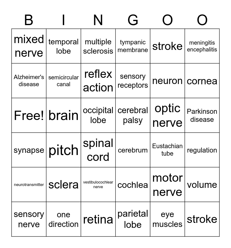 This bingo card has 36 words: cochlea, vestibulocochlear nerve, parietal lobe, Alzheimer's disease, synapse, cerebral palsy, semicircular canal, retina, stroke, motor nerve, cornea, tympanic membrane, volume, brain, sensory receptors, mixed nerve, neurotransmitter, optic nerve, Free!, multiple sclerosis, occipital lobe, pitch, cerebrum, spinal cord, Eustachian tube, temporal lobe, neuron, one direction, reflex action, meningitis encephalitis, stroke, sensory nerve, regulation, Parkinson disease, sclera and eye muscles.