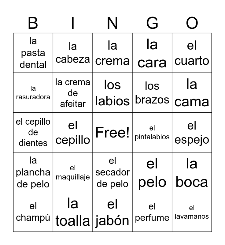 This bingo card has a free space and 29 words: el champú, el acondicionador, el cepillo, el peine, la pasta dental, la crema, la crema de afeitar, el maquillaje, el pintalabios, la toalla, el espejo, el lavamanos, el jabón, el perfume, la cama, el baño, el secador de pelo, la plancha de pelo, el cuarto, el cepillo de dientes, el pelo, el cuerpo, los brazos, la rasuradora, la cara, la cabeza, la boca, los labios and las axilas.