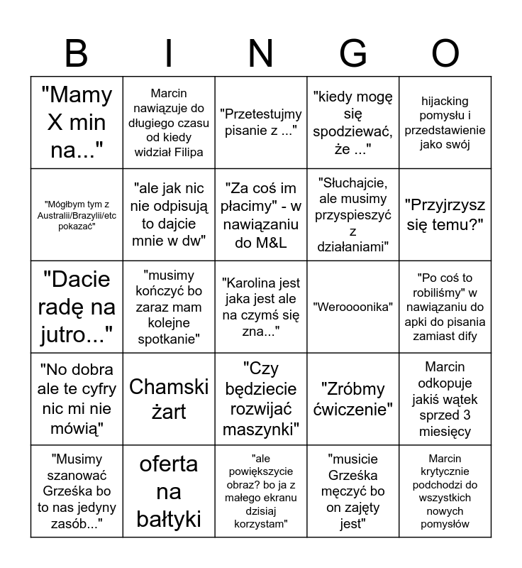 This bingo card has 25 words: Chamski żart, "ale powiększycie obraz? bo ja z małego ekranu dzisiaj korzystam", "Za coś im płacimy" - w nawiązaniu do M&L, "Musimy szanować Grześka bo to nas jedyny zasób...", hijacking pomysłu i przedstawienie jako swój, "Mamy X min na...", "Mógłbym tym z Australii/Brazylii/etc pokazać", Marcin nawiązuje do długiego czasu od kiedy widział Filipa, "Weroooonika", "Czy będziecie rozwijać maszynki", "Słuchajcie, ale musimy przyspieszyć z działaniami", "Dacie radę na jutro...", "Zróbmy ćwiczenie", Marcin odkopuje jakiś wątek sprzed 3 miesięcy, "ale jak nic nie odpisują to dajcie mnie w dw", Marcin krytycznie podchodzi do wszystkich nowych pomysłów, "Po coś to robiliśmy" w nawiązaniu do apki do pisania zamiast dify, "Przetestujmy pisanie z ...", "Przyjrzysz się temu?", "musimy kończyć bo zaraz mam kolejne spotkanie", "Karolina jest jaka jest ale na czymś się zna...", oferta na bałtyki, "No dobra ale te cyfry nic mi nie mówią", "kiedy mogę się spodziewać, że ..." and "musicie Grześka męczyć bo on zajęty jest".