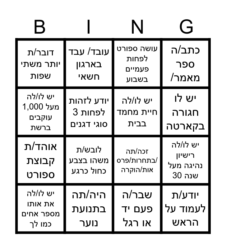 This bingo card has 29 words: Free!, יודע/ת להכין מאכל שהכינו הסבתות (חוה, מינה ופרידה), יש לו/לה רישיון נהיגה מעל 30 שנה, נולד/ה באותו חודש כמוך, דובר/ת יותר משתי שפות, עושה ספורט לפחות פעמיים בשבוע, יש לו/לה חיית מחמד בבית, שירת/ה כקצין/ה, היה/תה בתנועת נוער, יודע/ת לנגן על כלי נגינה, שבר/ה פעם יד או רגל, יש לו/לה את אותו מספר אחים כמו לך, גר/ה בתל אביב, ביקר/ה ביותר מ-3 יבשות, לובש/ת משהו בצבע כחול כרגע, השם שלו/ה קרוי על שם סבא/סבתא רבא, נולד/ה ביישוב שונה מזו שגר/ה בה היום, יודע/ת לעמוד על הראש, יש לו/לה מעל 1,000 עוקבים ברשת, זכה/תה בתחרות/פרס/ אות/הוקרה, כאן- בבית שערים נולד/ה וכאן נולדו לה/ו ילדיה/ו, התחתן/ה לפני יותר מ-20 שנה, אוהד/ת קבוצת ספורט, יודע לזהות לפחות 3 סוגי דגנים, כתב/ה ספר /מאמר, עובד/ עבד בארגון חשאי, יש לו/לה נסיון בעבודה בחקלאות, יש לו חגורה בקארטה and עובד / עבד בארגון חשאי.