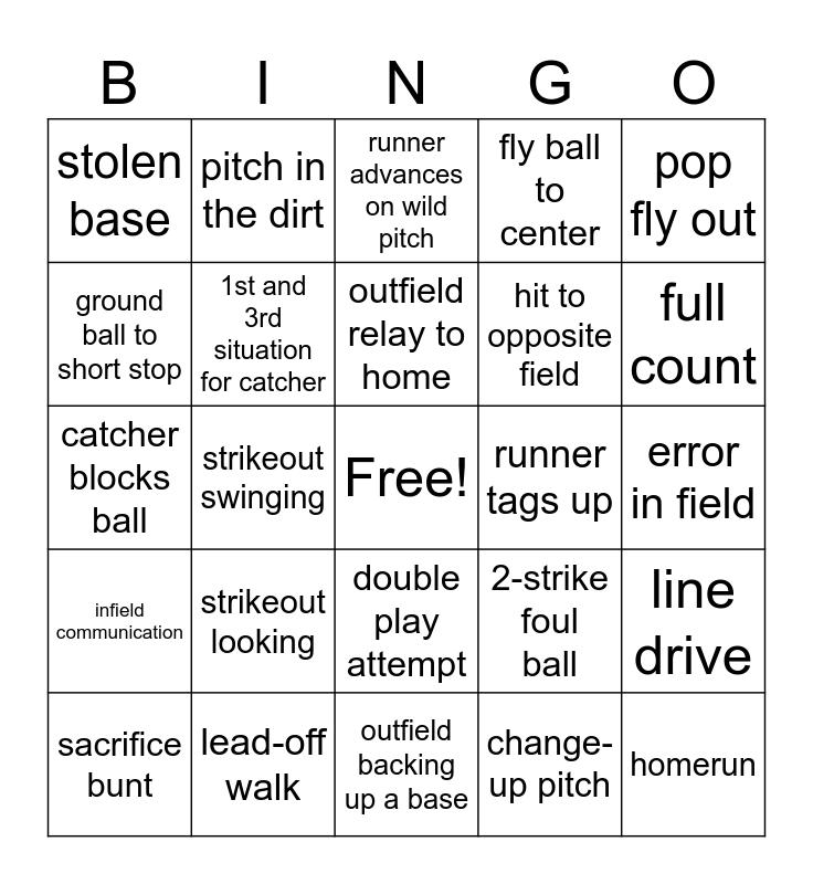 This bingo card has a free space and 24 words: strikeout looking, lead-off walk, outfield relay to home, sacrifice bunt, pop fly out, stolen base, ground ball to short stop, pitch in the dirt, runner tags up, double play attempt, hit to opposite field, catcher blocks ball, 2-strike foul ball, line drive, 1st and 3rd situation for catcher, change-up pitch, error in field, runner advances on wild pitch, full count, strikeout swinging, homerun, infield communication, fly ball to center and outfield backing up a base.