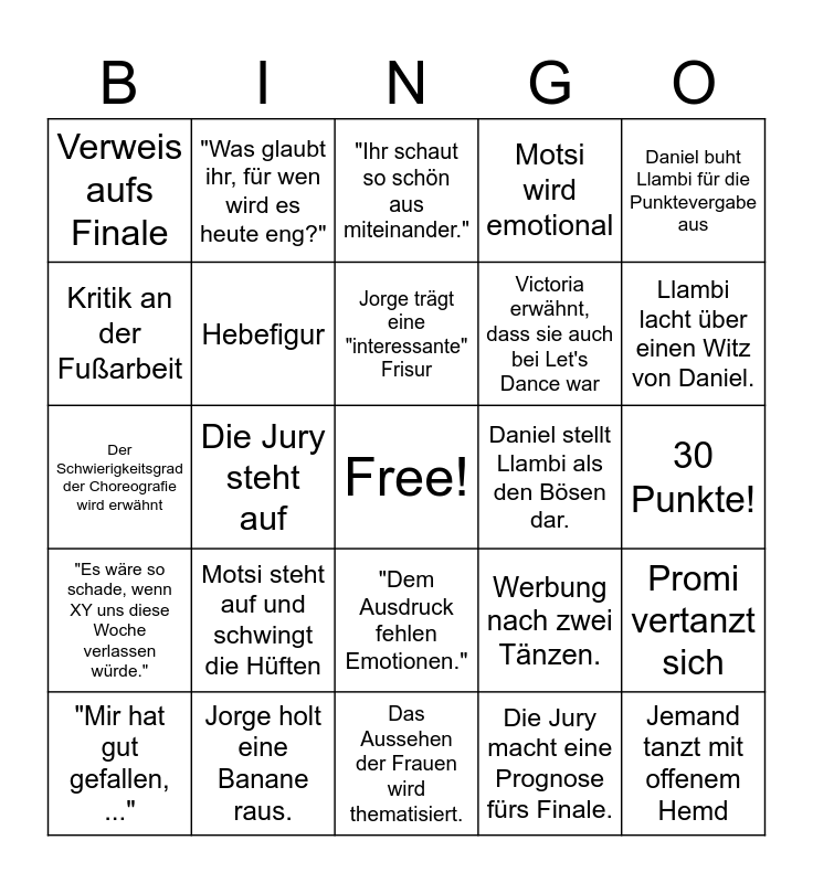 This bingo card has a free space and 38 words: "Bombe!", "Sexy Chico/Chica", Tänzer/-in aus vorheriger Staffel wird erwähnt, Hebefigur, Promi vertanzt sich, Motsi steht auf und schwingt die Hüften, Jorge trägt eine "interessante" Frisur, Daniel und Llambi liefern sich ein Wortgefecht, Daniel buht Llambi für die Punktevergabe aus, Victoria erwähnt, dass sie auch bei Let's Dance war, Die Jury steht auf, Motsi wird emotional, Jemand tanzt mit offenem Hemd, 30 Punkte!, Kritik an der Fußarbeit, "Es wäre so schade, wenn XY uns diese Woche verlassen würde.", Geld fliegt durchs Bild, "Ihr schaut so schön aus miteinander.", Strenge eines Profis wird betont, Daniel stellt Llambi als den Bösen dar., Verweis aufs Finale, Jorge holt eine Banane raus., Llambi lacht über einen Witz von Daniel., "Mir hat gut gefallen, ...", "In General", Das Aussehen der Frauen wird thematisiert., Daniel erwähnt, dass er aus Frankfurt kommt., "Du kannst mehr, trau dich was!", "Seid ihr zufrieden?", Die Let's Dance Familie wird erwähnt., Die Fußarbeit wird kritisiert., "Dem Ausdruck fehlen Emotionen.", Die Jury macht eine Prognose fürs Finale., "Was glaubt ihr, für wen wird es heute eng?", Für die nächste Woche wird eine Verbesserung gefordert., Werbung nach zwei Tänzen., Der Schwierigkeitsgrad der Choreografie wird erwähnt and Timon wird auf seine Mentalistenfähigkeiten angesprochen.