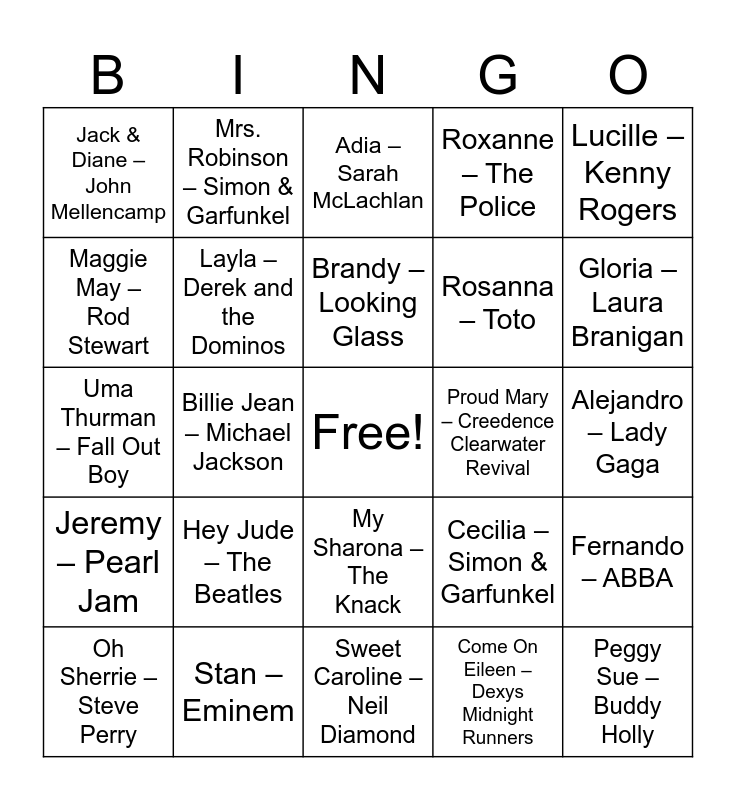 This bingo card has a free space and 49 words: Johnny B. Goode – Chuck Berry, Peggy Sue – Buddy Holly, Barbara Ann – The Beach Boys, Sweet Caroline – Neil Diamond, Hey Jude – The Beatles, Eleanor Rigby – The Beatles, Mrs. Robinson – Simon & Garfunkel, Jolene – Dolly Parton, Maggie May – Rod Stewart, Rhiannon – Fleetwood Mac, Layla – Derek and the Dominos, Roxanne – The Police, Fernando – ABBA, Cecilia – Simon & Garfunkel, Daniel – Elton John, Bad, Bad Leroy Brown – Jim Croce, Brandy – Looking Glass, Proud Mary – Creedence Clearwater Revival, Mustang Sally – Wilson Pickett, Lucille – Kenny Rogers, Billie Jean – Michael Jackson, Come On Eileen – Dexys Midnight Runners, Jack & Diane – John Mellencamp, Rosanna – Toto, Mickey – Toni Basil, Gloria – Laura Branigan, Oh Sherrie – Steve Perry, Janie’s Got a Gun – Aerosmith, My Sharona – The Knack, Jeremy – Pearl Jam, Iris – Goo Goo Dolls, Mary Jane’s Last Dance – Tom Petty, Buddy Holly – Weezer, Maria Maria – Santana, Stan – Eminem, Hey There Delilah – Plain White T’s, Valerie – Mark Ronson ft. Amy Winehouse, Stacy’s Mom – Fountains of Wayne, Alejandro – Lady Gaga, Grace Kelly – MIKA, Jenny from the Block – Jennifer Lopez, Dani California – Red Hot Chili Peppers, Ophelia – The Lumineers, Dear Maria, Count Me In – All Time Low, Uma Thurman – Fall Out Boy, Adia – Sarah McLachlan, Sasha Fierce – Beyoncé, Drew Barrymore – SZA and Levon – Elton John.