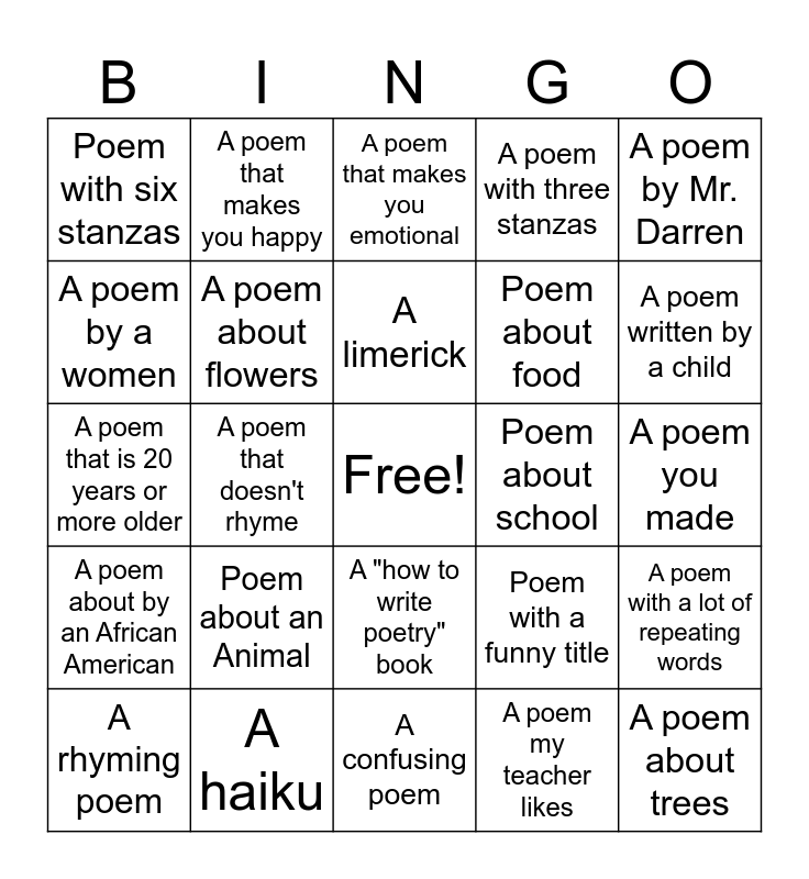 This bingo card has a free space and 24 words: Poem about an Animal, A haiku, A limerick, A rhyming poem, A poem by Mr. Darren, Poem with six stanzas, A poem by a women, A poem that makes you happy, Poem about school, A "how to write poetry" book, Poem about food, A poem that is 20 years or more older, Poem with a funny title, A poem with a lot of repeating words, A poem about flowers, A poem my teacher likes, A poem you made, A poem that makes you emotional, A poem written by a child, A poem that doesn't rhyme, A poem about trees, A poem about by an African American, A poem with three stanzas and A confusing poem.
