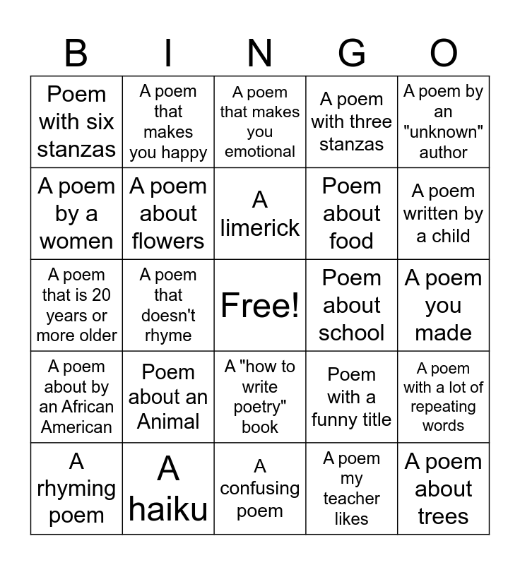 This bingo card has a free space and 24 words: Poem about an Animal, A haiku, A limerick, A rhyming poem, A poem by an "unknown" author, Poem with six stanzas, A poem by a women, A poem that makes you happy, Poem about school, A "how to write poetry" book, Poem about food, A poem that is 20 years or more older, Poem with a funny title, A poem with a lot of repeating words, A poem about flowers, A poem my teacher likes, A poem you made, A poem that makes you emotional, A poem written by a child, A poem that doesn't rhyme, A poem about trees, A poem about by an African American, A poem with three stanzas and A confusing poem.