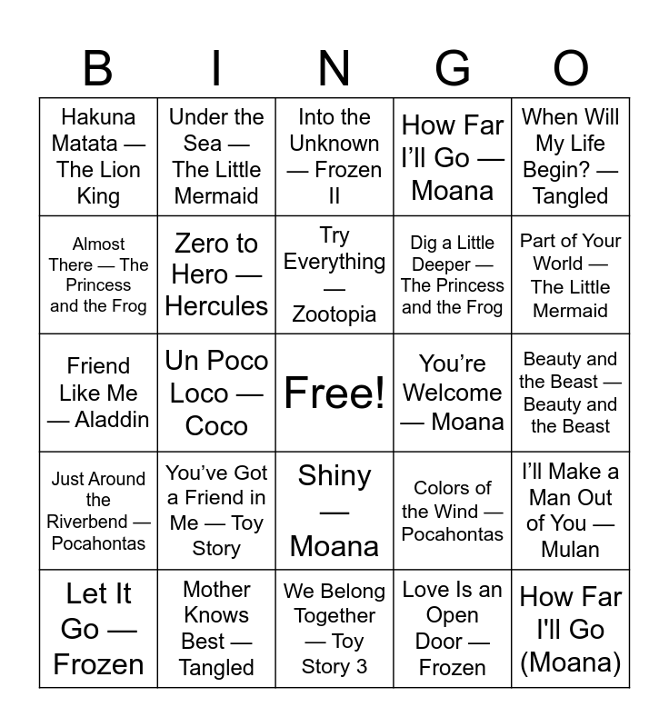This bingo card has a free space and 43 words: Part of your world (Little Mermaid), How Far I'll Go (Moana), I see the light, Let It Go — Frozen, Do You Want to Build a Snowman? — Frozen, Love Is an Open Door — Frozen, Into the Unknown — Frozen II, I See the Light — Tangled, When Will My Life Begin? — Tangled, Mother Knows Best — Tangled, How Far I’ll Go — Moana, You’re Welcome — Moana, Shiny — Moana, You’ve Got a Friend in Me — Toy Story, Strange Things — Toy Story, We Belong Together — Toy Story 3, A Whole New World — Aladdin, Friend Like Me — Aladdin, Prince Ali — Aladdin, Part of Your World — The Little Mermaid, Under the Sea — The Little Mermaid, Kiss the Girl — The Little Mermaid, Circle of Life — The Lion King, Hakuna Matata — The Lion King, Can You Feel the Love Tonight — The Lion King, Beauty and the Beast — Beauty and the Beast, Be Our Guest — Beauty and the Beast, Gaston — Beauty and the Beast, Colors of the Wind — Pocahontas, Just Around the Riverbend — Pocahontas, Reflection — Mulan, I’ll Make a Man Out of You — Mulan, Remember Me — Coco, Un Poco Loco — Coco, We Don’t Talk About Bruno — Encanto, Surface Pressure — Encanto, The Family Madrigal — Encanto, Try Everything — Zootopia, Almost There — The Princess and the Frog, Dig a Little Deeper — The Princess and the Frog, Go the Distance — Hercules, Zero to Hero — Hercules and He’s a Pirate — Pirates of the Caribbean.