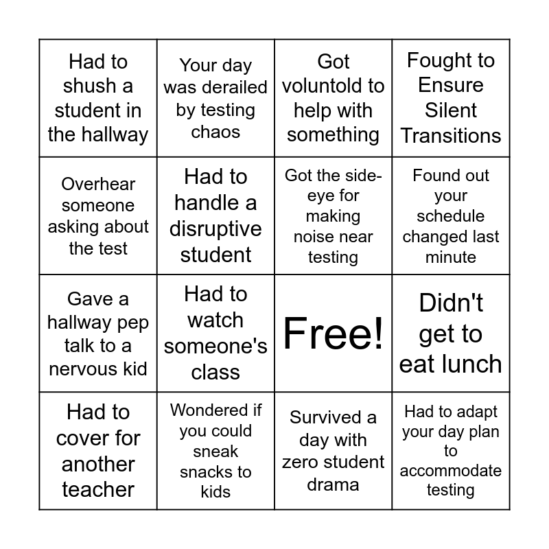 This bingo card has 21 words: Wondered if you could sneak snacks to kids, Felt personally victimized by the testing schedule (aka Regina George), Your day was derailed by testing chaos, Completely forgot it was testing week, Survived a day with zero student drama, Got the side-eye for making noise near testing, Had to shush a student in the hallway, Got voluntold to help with something, Free!, Found out your schedule changed last minute, Gave a hallway pep talk to a nervous kid, Fought to Ensure Silent Transitions, Had to adapt your day plan to accommodate testing, Had to switch classrooms or locations to accommodate testing, Had to handle a disruptive student, Someone announced the countdown till the end of school, Had to cover for another teacher, Had to watch someone's class, Overhear someone asking about the test, Didn't get to eat lunch and What planning?.