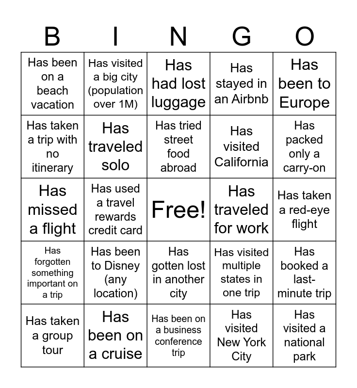 This bingo card has a free space and 40 words: Has visited 3+ countries, Has missed a flight, Speaks more than one language, Has traveled solo, Has been on a cruise, Has gotten lost in another city, Has tried street food abroad, Has taken a road trip over 5 hours, Has been to Europe, Has forgotten something important on a trip, Has used a travel rewards credit card, Has stayed in an Airbnb, Has visited a national park, Has taken a red-eye flight, Has traveled for work, Has been to Disney (any location), Has taken a train in another country, Has been on a beach vacation, Has gone camping, Has had lost luggage, Has booked a last-minute trip, Has visited New York City, Has visited California, Has taken a trip with no itinerary, Has gone on a family vacation with 5+ people, Has used Google Maps in another country, Has had a flight delay over 3 hours, Has taken a weekend getaway, Has traveled internationally in the last year, Has been to a famous landmark (Eiffel Tower, etc.), Has tried food they couldn’t pronounce, Has taken a group tour, Has gone snorkeling or scuba diving, Has visited multiple states in one trip, Has packed only a carry-on, Has been on a business conference trip, Has traveled somewhere warm in winter, Has taken a spontaneous trip, Has visited a big city (population over 1M) and Has a dream destination bucket list.