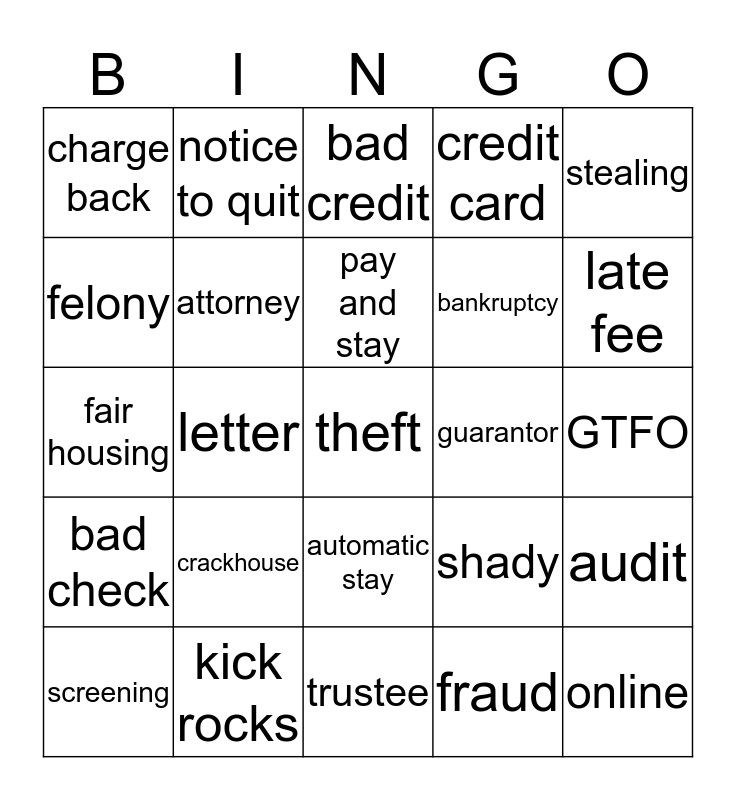 This bingo card has 60 words: crack house, kick rocks, eviction, bad check, fraud, money order, attorney, lock box, bankruptcy, check, credit card, criminal, felony, cash money, Benjamins, charge back, theft, stealing, skip, pay and stay, guarantor, bad credit, screening, audit, manager, maintenance, lease, rent, late fee, termination fee, writ, court date, 3-day, 14-day, notice to quit, vacate, email, letter, occupancy, fair housing, discrimination, crackhouse, GTFO, drug dealer, shady, pervert, concessions, warrant, civil, automatic stay, trustee, red flag, levy, chapter 7, chapter 13, chedda', consistent, broke, online and attorney.