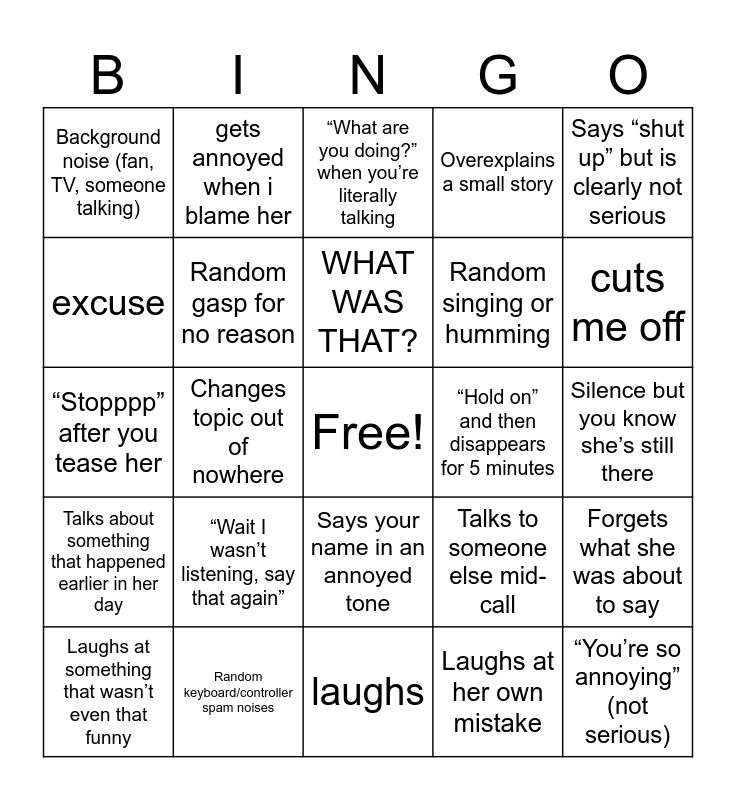This bingo card has a free space and 24 words: “Wait I wasn’t listening, say that again”, Random keyboard/controller spam noises, WHAT WAS THAT?, Laughs at something that wasn’t even that funny, Says “shut up” but is clearly not serious, Background noise (fan, TV, someone talking), excuse, gets annoyed when i blame her, “Hold on” and then disappears for 5 minutes, Says your name in an annoyed tone, Random singing or humming, “Stopppp” after you tease her, Talks to someone else mid-call, Forgets what she was about to say, Random gasp for no reason, Laughs at her own mistake, Silence but you know she’s still there, “What are you doing?” when you’re literally talking, cuts me off, Changes topic out of nowhere, “You’re so annoying” (not serious), Talks about something that happened earlier in her day, Overexplains a small story and laughs.