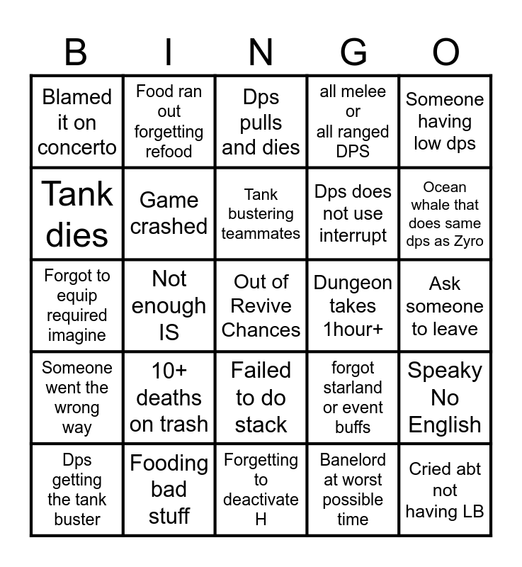 This bingo card has 25 words: 10+ deaths on trash, Forgetting to deactivate H, Tank bustering teammates, Dps getting the tank buster, Someone having low dps, Blamed it on concerto, Tank dies, Food ran out forgetting refood, Dungeon takes 1hour+, Failed to do stack, Dps does not use interrupt, Forgot to equip required imagine, forgot starland or event buffs, Speaky No English, Game crashed, Cried abt not having LB, Ask someone to leave, Dps pulls and dies, Ocean whale that does same dps as Zyro, Not enough IS, Out of Revive Chances, Fooding bad stuff, Someone went the wrong way, all melee or all ranged DPS and Banelord at worst possible time.