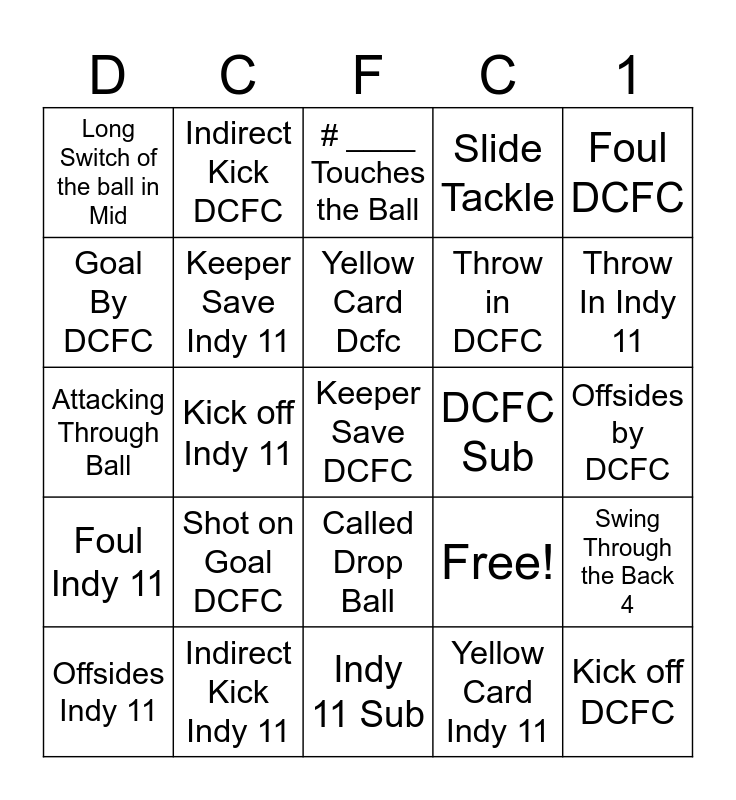 This bingo card has 25 words: Shot on Goal DCFC, Indy 11 Sub, Yellow Card Dcfc, Offsides Indy 11, Foul DCFC, Long Switch of the ball in Mid, Goal By DCFC, Indirect Kick DCFC, DCFC Sub, Called Drop Ball, Throw in DCFC, Attacking Through Ball, Free!, Swing Through the Back 4, Keeper Save Indy 11, Kick off DCFC, Offsides by DCFC, # ____ Touches the Ball, Throw In Indy 11, Kick off Indy 11, Keeper Save DCFC, Indirect Kick Indy 11, Foul Indy 11, Slide Tackle and Yellow Card Indy 11.