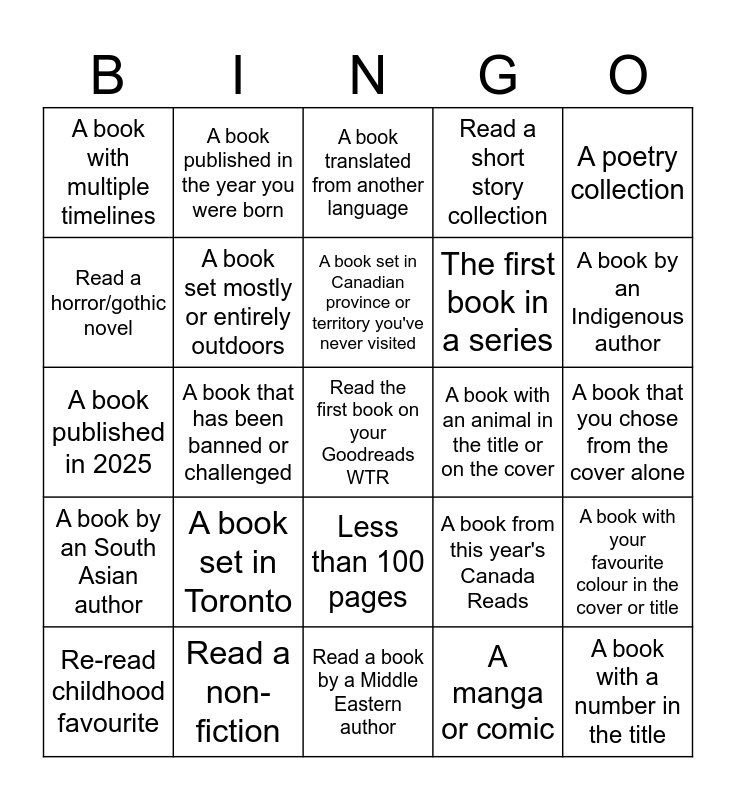 This bingo card has a free space and 24 words: A book set in Toronto, Read a non-fiction, A book set in Canadian province or territory you've never visited, Re-read childhood favourite, A poetry collection, A book with multiple timelines, Read a horror/gothic novel, A book published in the year you were born, A book with an animal in the title or on the cover, Less than 100 pages, The first book in a series, A book published in 2025, A book from this year's Canada Reads, A book with your favourite colour in the cover or title, A book set mostly or entirely outdoors, A manga or comic, A book that you chose from the cover alone, A book translated from another language, A book by an Indigenous author, A book that has been banned or challenged, A book with a number in the title, A book by an South Asian author, Read a short story collection and Read a book by a Middle Eastern author.