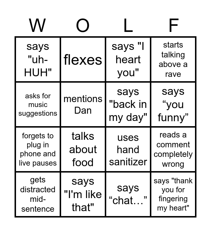 This bingo card has 22 words: says "I'm like that", adjusts camera, flexes, gives random motivational speech, mentions Dan, says "back in my day", says "uh-HUH", says "I heart you", uses hand sanitizer, says "thank you for fingering my heart", forgets to plug in phone and live pauses, starts talking above a rave, says "shut up NM", says "how's y'all's day?", says “chat…”, laughs at his own joke, reads a comment completely wrong, gets distracted mid-sentence, talks about food, asks for music suggestions, says “you funny” and starts singing randomly.