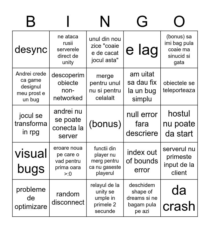 This bingo card has a free space and 24 words: eroare noua pe care o vad pentru prima oara >:0, random disconnect, merge pentru unul nu si pentru celalalt, probleme de optimizare, (bonus) sa imi bag pula coaie ma sinucid si gata, desync, Andrei crede ca game designul meu prost e un bug, ne ataca rusii serverele direct de unity, null error fara descriere, functii din player nu merg pentru ca nu gaseste playerul, am uitat sa dau fix la un bug simplu, jocul se transforma in rpg, index out of bounds error, serverul nu primeste input de la client, descoperim obiecte non-networked, deschidem shape of dreams si ne bagam pula pe azi, hostul nu poate da start, unul din nou zice "coaie e de cacat jocul asta", obiectele se teleporteaza, andrei nu se poate conecta la server, da crash, visual bugs, e lag and relayul de la unity se umple in primele 2 secunde.