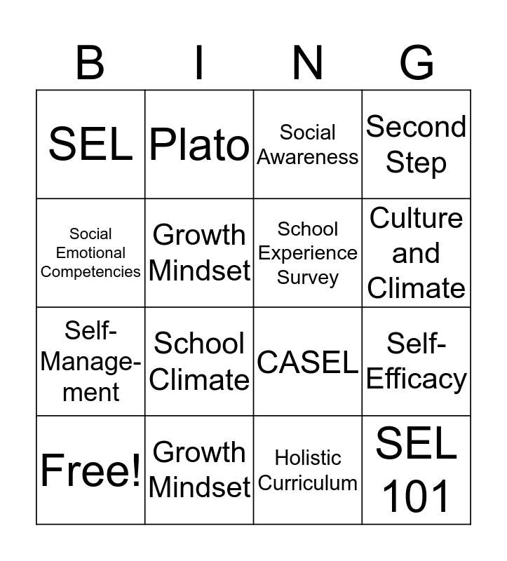 This bingo card has 16 words: Growth Mindset, Self-Efficacy, Social Awareness, SEL, Self-Manage-ment, Plato, CASEL, Holistic Curriculum, Social Emotional Competencies, Growth Mindset, Free!, Second Step, School Climate, Culture and Climate, School Experience Survey and SEL 101.