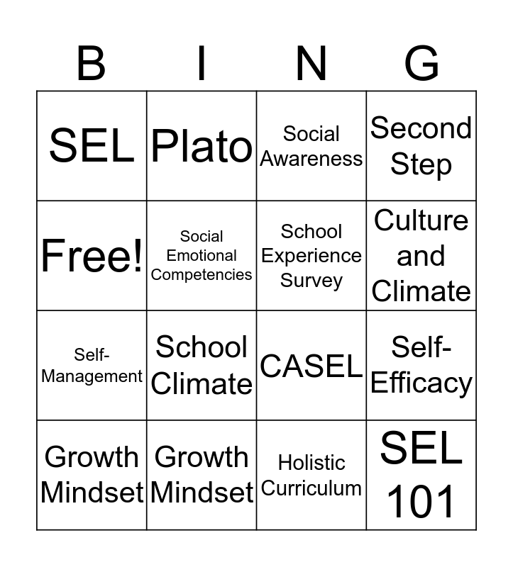 This bingo card has 16 words: Growth Mindset, Self-Efficacy, Social Awareness, SEL, Self-Management, Plato, CASEL, Holistic Curriculum, Free!, Social Emotional Competencies, Growth Mindset, Second Step, School Climate, Culture and Climate, School Experience Survey and SEL 101.