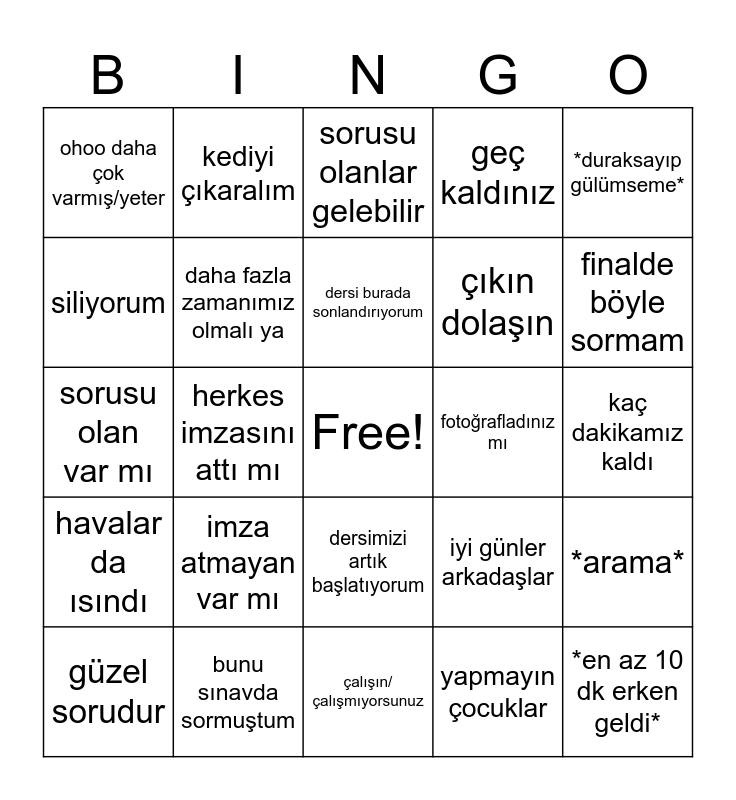 This bingo card has a free space and 24 words: imza atmayan var mı, bunu sınavda sormuştum, dersi burada sonlandırıyorum, güzel sorudur, *duraksayıp gülümseme*, ohoo daha çok varmış/yeter, siliyorum, kediyi çıkaralım, fotoğrafladınız mı, dersimizi artık başlatıyorum, çıkın dolaşın, sorusu olan var mı, iyi günler arkadaşlar, *arama*, daha fazla zamanımız olmalı ya, yapmayın çocuklar, kaç dakikamız kaldı, sorusu olanlar gelebilir, finalde böyle sormam, herkes imzasını attı mı, *en az 10 dk erken geldi*, havalar da ısındı, geç kaldınız and çalışın/çalışmıyorsunuz.