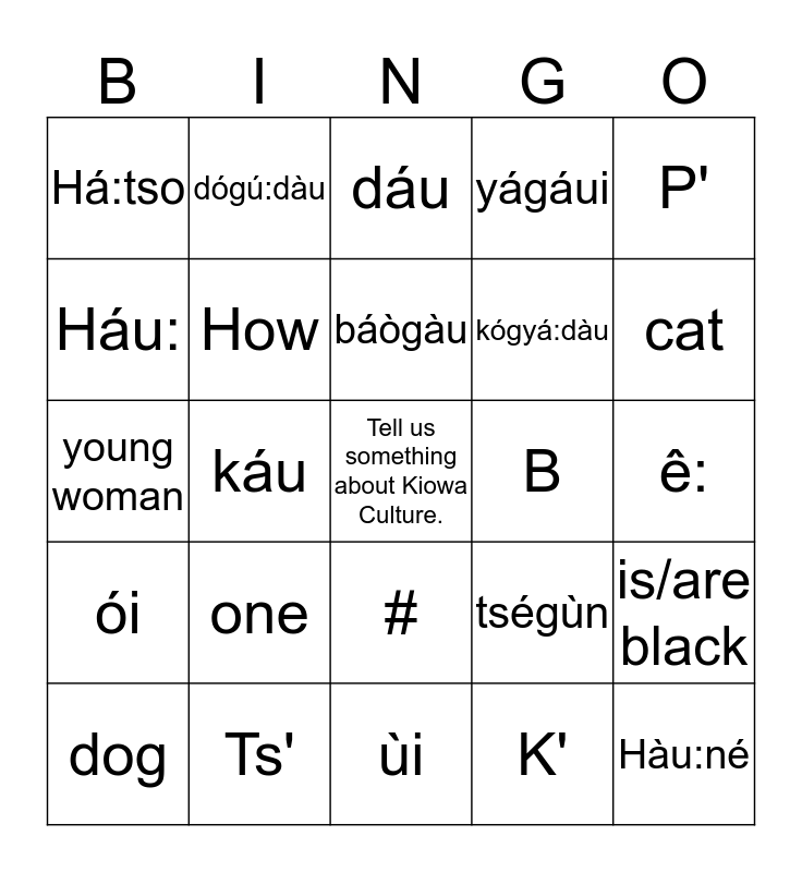 This bingo card has a free space and 24 words: one, Ts', báògàu, dog, P', Há:tso, Háu:, dógú:dàu, B, #, kógyá:dàu, young woman, tségùn, is/are black, How, K', ê:, dáu, cat, káu, Hàu:né, ói, yágáui and ùi.