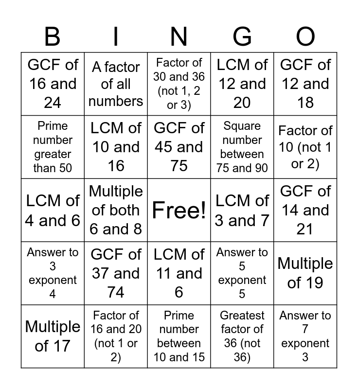 This bingo card has a free space and 35 words: Multiple of 11, GCF of 28 and 42, Factor of 39 and 52, LCM of 10 and 16, LCM of 11 and 6, LCM of 12 and 20, Prime number greater than 50, Greatest factor of 50 (not 50), GCF of 45 and 75, LCM of 3, 4, and 9, LCM of 4 and 6, GCF of 12 and 18, GCF of 24 and 36, LCM of 8 and 9, GCF of 16 and 24, LCM of 3 and 7, Greatest factor of 36 (not 36), Multiple of both 6 and 8, Answer to 3 exponent 4, Answer to 7 exponent 3, Answer to 5 exponent 5, Multiple of 17, Multiple of 19, Factor of 16 and 20 (not 1 or 2), Factor of 30 and 36 (not 1, 2 or 3), Factor of 10 (not 1 or 2), Factor of 22 (not 1, 2 or 22), Prime number between 40 and 50, Square number between 75 and 90, GCF of 14 and 21, Prime number between 20 and 30, Prime number between 10 and 15, GCF of 37 and 74, A factor of all numbers and Answer to 2 exponent 5.