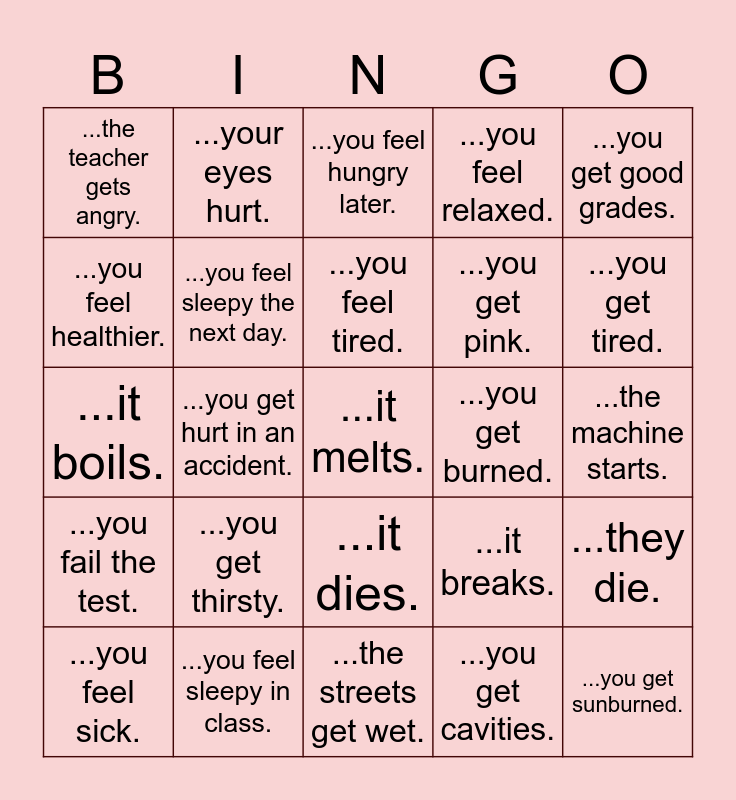 This bingo card has 25 words: ...you get thirsty., ...the streets get wet., ...you feel tired., ...you feel sick., ...you get good grades., ...the teacher gets angry., ...you feel healthier., ...your eyes hurt., ...you get burned., ...it dies., ...you get pink., ...it boils., ...it breaks., ...they die., ...you feel sleepy the next day., ...you get sunburned., ...the machine starts., ...you feel hungry later., ...you get tired., ...you get hurt in an accident., ...it melts., ...you feel sleepy in class., ...you fail the test., ...you feel relaxed. and ...you get cavities..