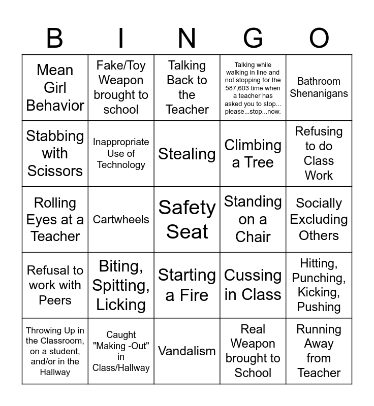 This bingo card has a free space and 24 words: Biting, Spitting, Licking, Caught "Making -Out" in Class/Hallway, Stealing, Throwing Up in the Classroom, on a student, and/or in the Hallway, Bathroom Shenanigans, Mean Girl Behavior, Stabbing with Scissors, Fake/Toy Weapon brought to school, Standing on a Chair, Starting a Fire, Climbing a Tree, Rolling Eyes at a Teacher, Cussing in Class, Hitting, Punching, Kicking, Pushing, Inappropriate Use of Technology, Real Weapon brought to School, Socially Excluding Others, Talking Back to the Teacher, Refusing to do Class Work, Cartwheels, Running Away from Teacher, Refusal to work with Peers, Talking while walking in line and not stopping for the 587,603 time when a teacher has asked you to stop... please...stop...now. and Vandalism.