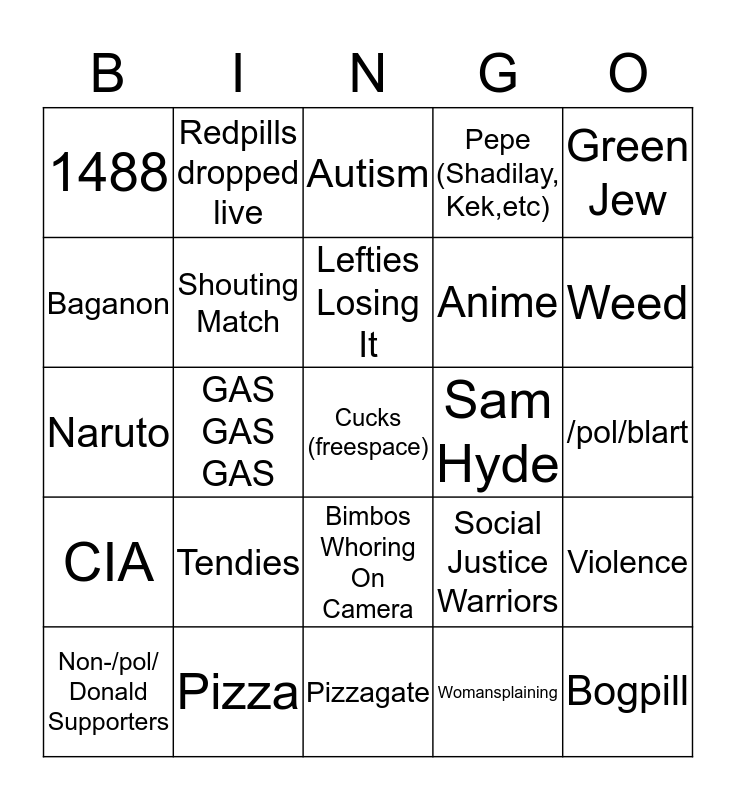 This bingo card has a free space and 24 words: Tendies, Pizza, Lefties Losing It, Non-/pol/ Donald Supporters, Green Jew, 1488, Baganon, Redpills dropped live, Sam Hyde, Bimbos Whoring On Camera, Anime, Naruto, Social Justice Warriors, Violence, Shouting Match, Womansplaining, /pol/blart, Autism, Weed, GAS GAS GAS, Bogpill, CIA, Pepe (Shadilay, Kek,etc) and Pizzagate.