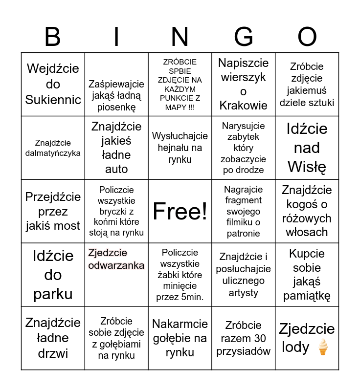 This bingo card has a free space and 24 words: Zjedzcie odwarzanka, Zróbcie sobie zdjęcie z gołębiami na rynku, Wysłuchajcie hejnału na rynku, Znajdźcie ładne drzwi, Zróbcie zdjęcie jakiemuś dziele sztuki, Wejdźcie do Sukiennic, Znajdźcie dalmatyńczyka, Zaśpiewajcie jakąś ładną piosenkę, Nagrajcie fragment swojego filmiku o patronie, Policzcie wszystkie żabki które minięcie przez 5min., Narysujcie zabytek który zobaczycie po drodze, Przejdźcie przez jakiś most, Znajdźcie i posłuchajcie ulicznego artysty, Kupcie sobie jakąś pamiątkę, Znajdźcie jakieś ładne auto, Zróbcie razem 30 przysiadów, Znajdźcie kogoś o różowych włosach, ZRÓBCIE SPBIE ZDJĘCIE NA KAŻDYM PUNKCIE Z MAPY !!!, Idźcie nad Wisłę, Policzcie wszystkie bryczki z końmi które stoją na rynku, Zjedzcie lody 🍦, Idźcie do parku, Napiszcie wierszyk o Krakowie and Nakarmcie gołębie na rynku.