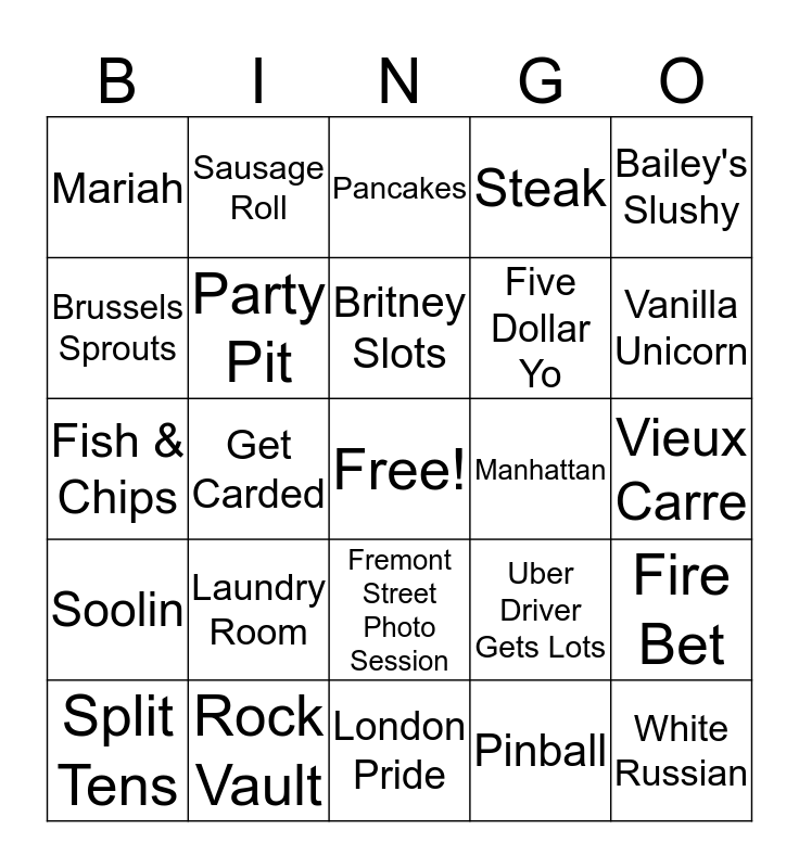 This bingo card has a free space and 24 words: Laundry Room, Rock Vault, Britney Slots, Split Tens, Bailey's Slushy, Mariah, Brussels Sprouts, Sausage Roll, Manhattan, Fremont Street Photo Session, Five Dollar Yo, Fish & Chips, Uber Driver Gets Lots, Fire Bet, Party Pit, Pinball, Vieux Carre, Pancakes, Vanilla Unicorn, Get Carded, White Russian, Soolin, Steak and London Pride.