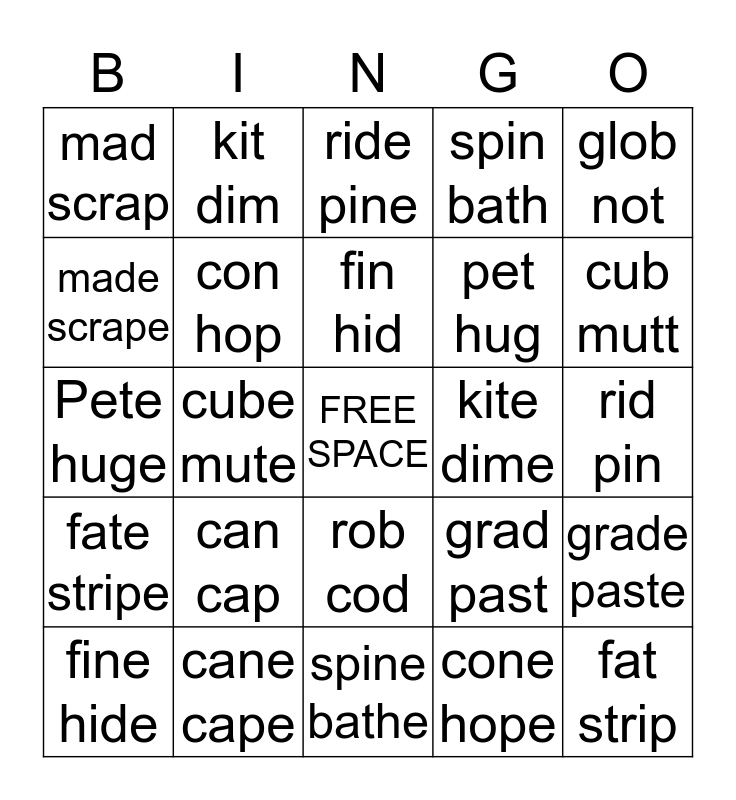 This bingo card has a free space and 24 words: can cap, cane cape, fin hid, fine hide, glob not, mad scrap, made scrape, kit dim, kite dime, rob cod, pet hug, Pete huge, grad past, grade paste, con hop, cone hope, rid pin, ride pine, cub mutt, cube mute, fat strip, fate stripe, spin bath and spine bathe.
