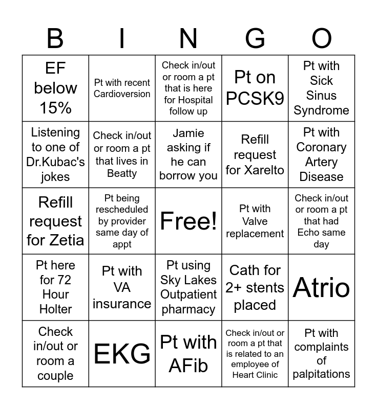 This bingo card has a free space and 29 words: Pt that just had watchman device placed with in the last 6 months, EKG, Check in/out or room a pt that is here for Hospital follow up, Check in/out a pt in clinic for stress test, Pt with Sick Sinus Syndrome, EF below 15%, Check in/out or room a pt that lives in Beatty, Jamie asking if he can borrow you, Pt with Valve replacement, Atrio, Check in/out or room a couple, Pt being rescheduled by provider same day of appt, Check in/out or room a pt that is related to an employee of Heart Clinic, Pt with complaints of palpitations, Refill request for Zetia, Pt with history of CABG, Pt with AFib, Cath for 2+ stents placed, Pt with Coronary Artery Disease, Pt here for 72 Hour Holter, Pt with VA insurance, Check in/out or room a pt for Leqvio injection, Refill request for Xarelto, Check in/out or room a pt that had Echo same day, Listening to one of Dr.Kubac's jokes, Pt with recent Cardioversion, Pt using Sky Lakes Outpatient pharmacy, Pt on PCSK9 and Pt with complaints of chest pain.