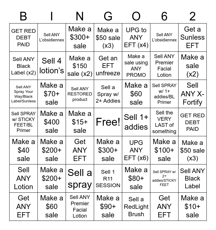 ⚠ This card has duplicate items: Make a $10 sale (x3) (2), Make a $15 sale (2), Make a $20 sale (x2) (2), Make a $40 sale (2), Make a $50 sale (x3) (2), Make a $60 sale (2), Make a $70 sale (x2) (2), Make an $80 sale (2), Make a $90 sale (x2) (2), Make a $100+ sale (4), Make a $150 sale (x2) (2), Make a $200 sale (2), Make a sale (x2) (2), Make a $300 sale (2), Make a $400 sale (2), UPG ANY EFT (x6) (2), Sell 1 sunless/spray (2), Sell SPRAY w/ STICKY FEET (2), Sell SPRAY w/ STICKY FEET/BL Primer (2), Sell SPRAY w/ 2+ addies/STICKY FEET (2), Sell SPRAY w/ 1+ addies/BL Primer (2), Sell 1+ addies (2), Sell 2+ addies (x2) (2), Sell 3+ addies (x3) (2), Make a sale using ANY PROMO (2), Sell ANY L’obsidiennex (2), Sell ANY LOBS UV (2), Sell City Lips/Teleties (2), Sell the VERY LAST of something (2), Sell ANY Black Label (x2) (2), Sell ANY Black Label (2), Sell ANY Spray Your Way/Black Label/Sunless (2), Sell ANY Lotion (3), Sell ANY FACE Lotion (2), Sell ANY RESTORED product (2), Sell ANY Tan Extender (2), Sell 4 lotion’s (2), UPG to ANY EFT (x4) (2), Sell ANY Premier Facial Lotion (2), Sell a Spray w/ 2+ Addies (2), Get a Sunless EFT (2), Get ANY EFT (6), Sell Any SYW Product (2), Sell a RedLight Brush (2), Sell ANY X-Fortify (3), Sell any Tan extender (2), Sell 1 R11 SESSION (2), ANY face lotion (2), Make a $5+ sale (2), Make a $10+ sale (2), Make a $15+ sale (2), Make a $20+ sale (2), Make a $40+ sale (2), Make a $60+ sale (2), Make a $70+ sale (2), Make a $80+ sale (2), Make a $90+ sale (2), Make a $200+ sale (2), Make a $300+ sale (2), GET RED DEBT PAID (2), Get an EFT unfreeze (2), Get a Stay & Save (x3) (2), Sell Any Black Label (2)