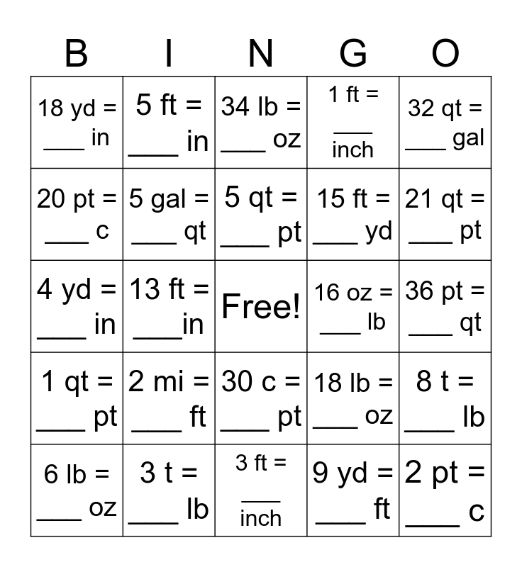 This bingo card has a free space and 24 words: 2 mi = ___ ft, 3 t = ___ lb, 5 qt = ___ pt, 6 lb = ___ oz, 32 qt = ___ gal, 18 yd = ___ in, 20 pt = ___ c, 5 ft = ___ in, 16 oz = ___ lb, 30 c = ___ pt, 15 ft = ___ yd, 4 yd = ___ in, 18 lb = ___ oz, 8 t = ___ lb, 5 gal = ___ qt, 9 yd = ___ ft, 36 pt = ___ qt, 34 lb = ___ oz, 21 qt = ___ pt, 13 ft = ___in, 2 pt = ___ c, 1 qt = ___ pt, 1 ft = ___ inch and 3 ft = ___ inch.