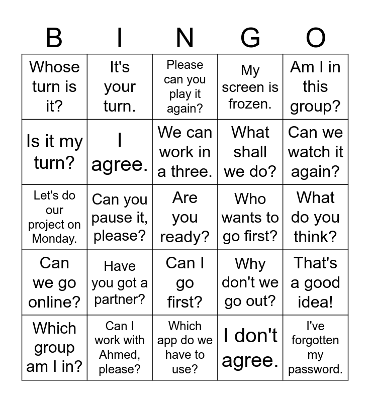 This bingo card has a free space and 24 words: Have you got a partner?, Can I work with Ahmed, please?, We can work in a three., Which group am I in?, Am I in this group?, Whose turn is it?, Is it my turn?, It's your turn., Who wants to go first?, Can I go first?, What shall we do?, Let's do our project on Monday., Why don't we go out?, That's a good idea!, I agree., I don't agree., What do you think?, Please can you play it again?, Can we watch it again?, Can you pause it, please?, I've forgotten my password., Can we go online?, My screen is frozen. and Which app do we have to use?.