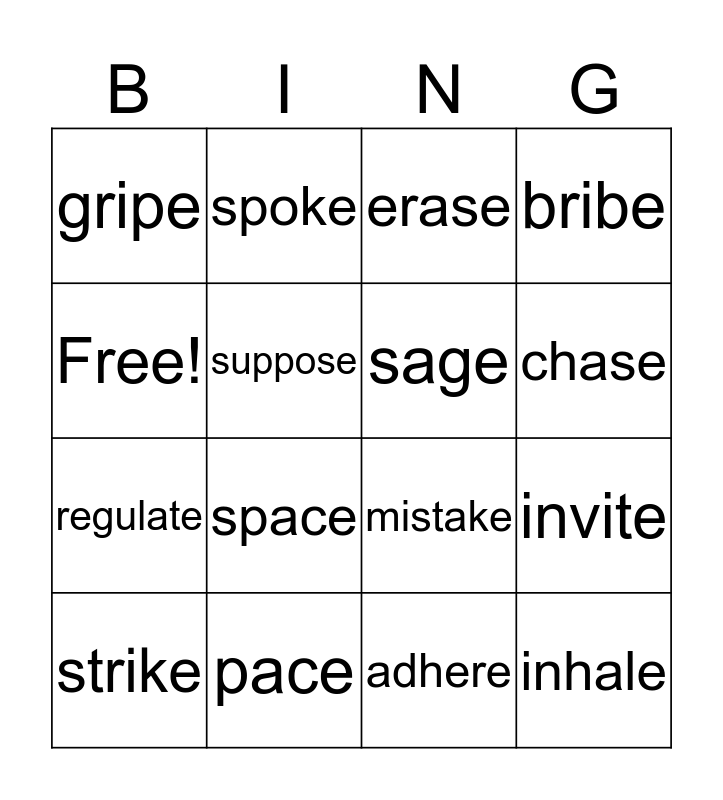 This bingo card has 16 words: pace, invite, erase, gripe, regulate, spoke, mistake, adhere, Free!, suppose, strike, bribe, space, chase, sage and inhale.