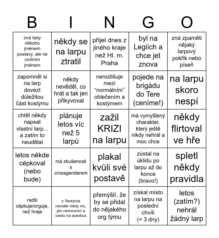 This bingo card has a free space and 24 words: má zkušenosti s crossgenderem, z Terezína neviděl nikdy nic, jen nemocnici a cestu na autobus, nerozlišuje mezi “normálním” oblečením a kostýmem, radši cépkuje/orguje, než hraje, zná zpaměti nějaký larpový pokřik nebo píseň, zná tady někoho jménem postavy, ale ne civilním jménem, zapomněl si na larp dovézt důležitou část kostýmu, někdy se na larpu ztratil, má vymyšlený charakter, který ještě nikdy nehrál a moc chce, plakal kvůli své postavě, pojede na brigádu do Tere (ceníme!), chtěl někdy napsat vlastní larp... a zatím to neudělal, zůstal na úklidu po larpu až do konce (bravo!), spletl někdy pravidla, někdy nevěděl, co hrát a tak jen přikyvoval, získal místo na larpu na poslední chvíli (< 3 dny), někdy flirtoval ve hře, přijel dnes z jiného kraje než Hl. m. Praha, na larpu skoro nespí, plánuje letos víc než 5 larpů, letos (zatím?) nehrál žádný larp, letos někde cépkoval (nebo bude), byl na Legiích a chce jet znova and přemýšlí, že by se přidal do nějakého org týmu.