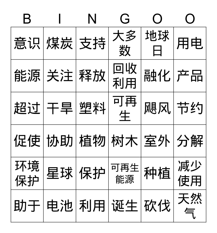 This bingo card has 36 words: 可再生能源, 保护, 诞生, 能源, 促使, 可再生, 关注, 利用, 地球日, 种植, 产品, 大多数, 减少使用, 干旱, 回收利用, 意识, 环境保护, 飓风, 超过, 支持, 塑料, 协助, 树木, 植物, 室外, 煤炭, 融化, 电池, 释放, 用电, 天然气, 助于, 分解, 节约, 星球 and 砍伐.