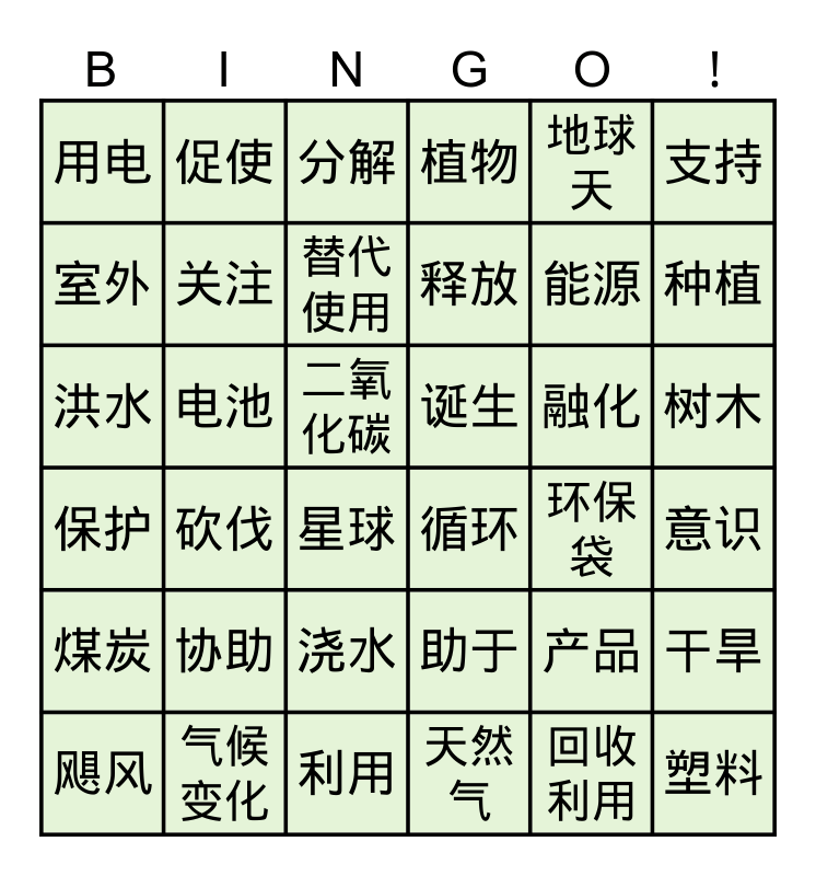 This bingo card has 36 words: 助于, 浇水, 天然气, 室外, 保护, 诞生, 关注, 利用, 地球天, 产品, 种植, 植物, 干旱, 电池, 释放, 用电, 煤炭, 融化, 洪水, 分解, 二氧化碳, 砍伐, 循环, 星球, 环保袋, 促使, 能源, 气候变化, 替代使用, 支持, 塑料, 飓风, 意识, 树木, 协助 and 回收利用.